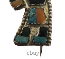 Delve into the rich heritage of Native American jewelry with this vintage Zuni inlaid Rainbow Man Dancer pin brooch. Crafted with care, the piece showcases a stunning array of colors including turquoise, onyx, coral, and Mother of Pearl, set against the lustrous sterling silver backdrop. The flush setting style highlights the natural stones, each one a unique testament to the craftsmanship of the Zuni tribe.